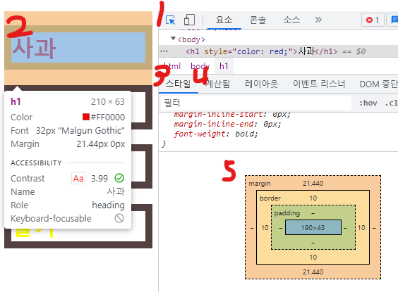 3. h1을 스타일링 함으로써 박스(5)에 보이는 margin, border, padding 의 속성(너비, 색깔, 모양 등)을 정할 수 있다.